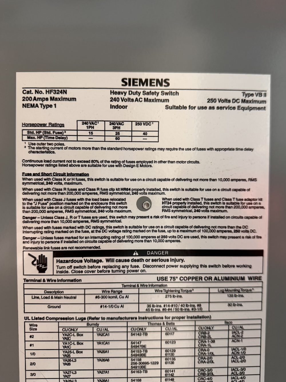 240 Vac / 250 Vdc